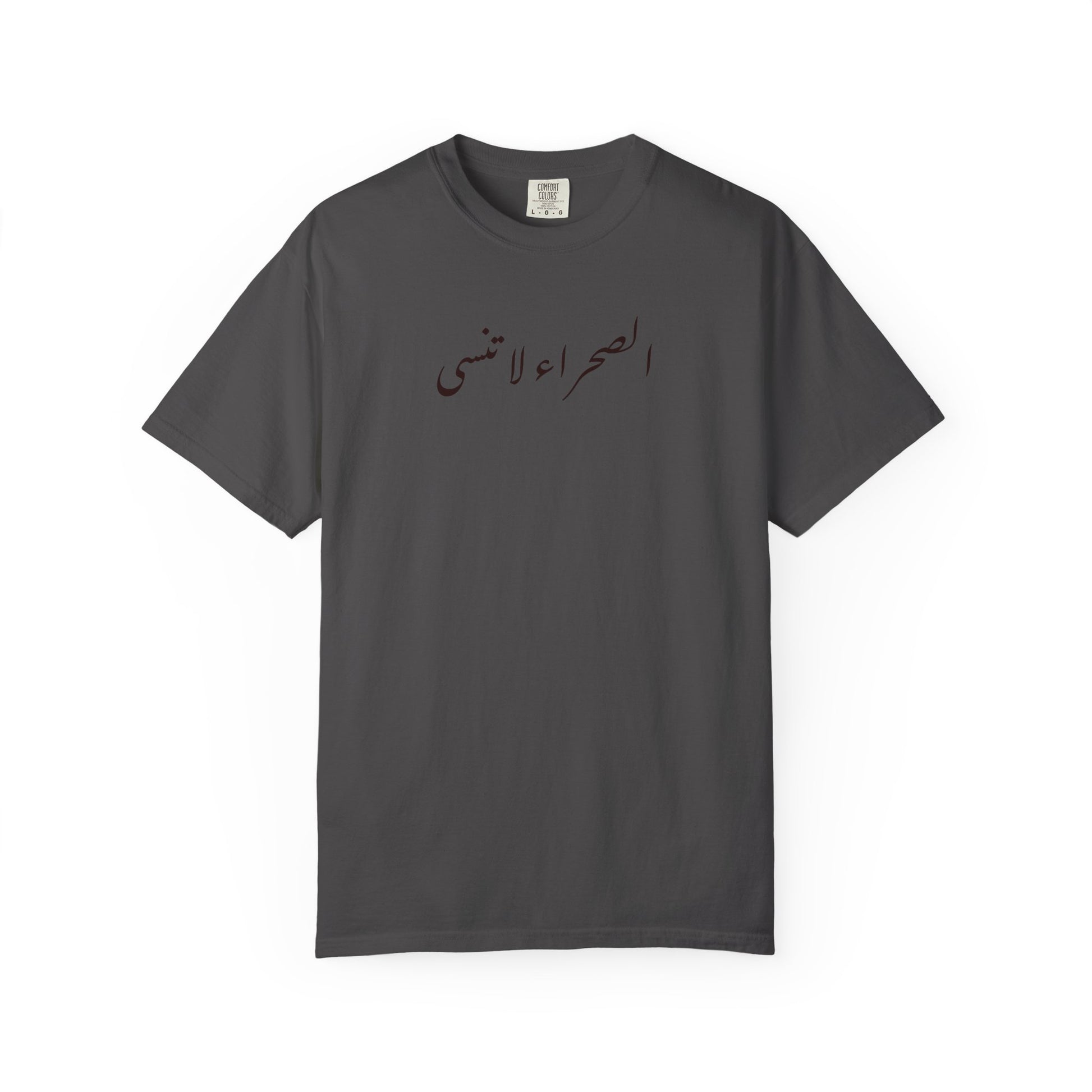 Featured on the front "الصحراء لا تنسى" means "The desert does not forget". Featuring Saifulla raises a falcon against a crimson storm on the back. This tee captures fierce balance between control and chaos. Sharp wings, sharper will.
