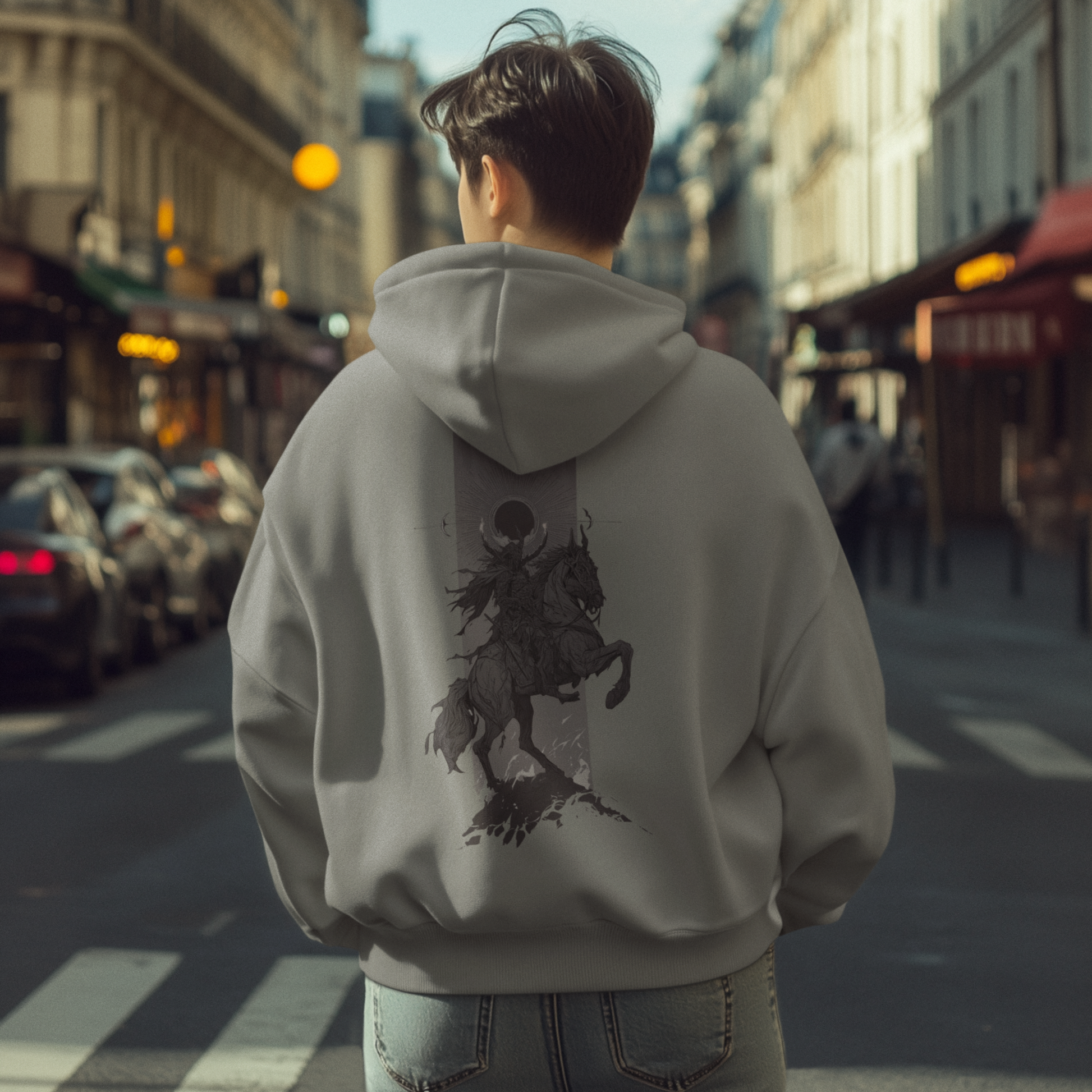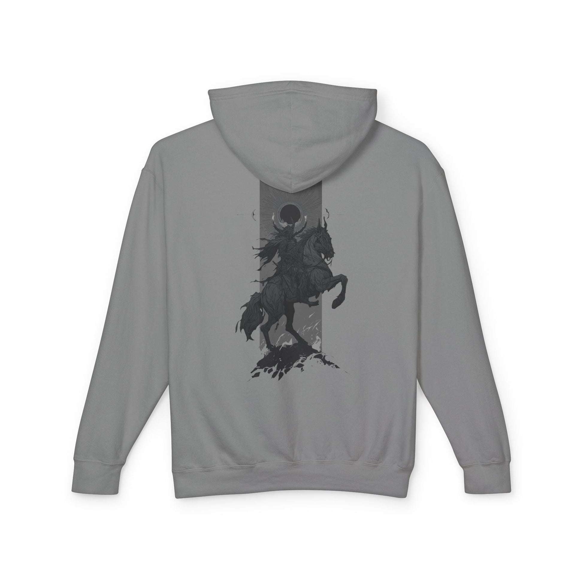 Shadow meets legend in the Eclipse Rider Hoodie. This design rides straight out of myth, with a dark horseman charging beneath an eclipsed sun. It’s a bold graphic that flips the script on streetwear, part battle cry, part moving artwork. Made for those who wear their presence like armor, too real to blend in.