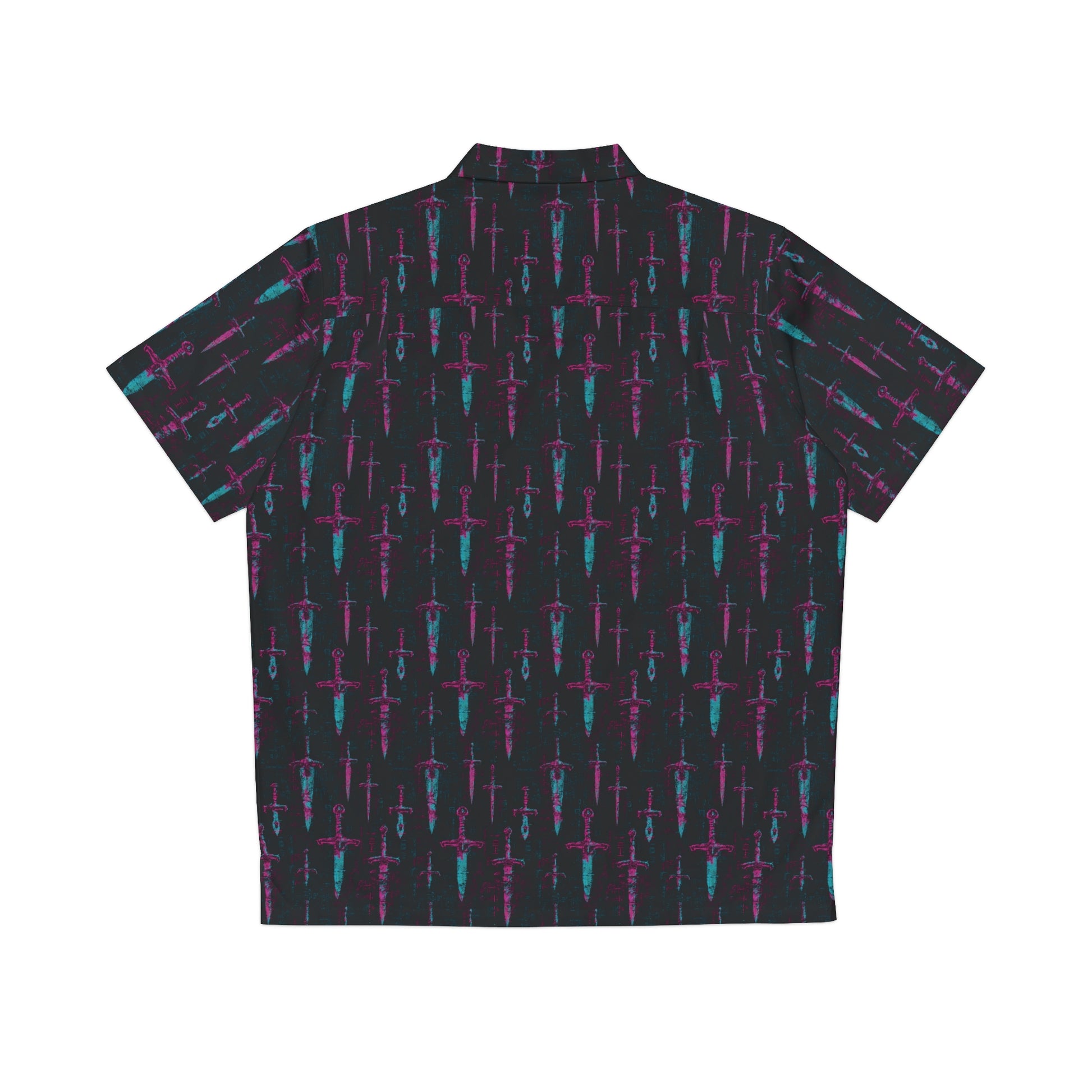 Electric purple and aqua blades slash across black, a cyber tropical pattern with main character energy. Futuristic, fast, and fearless, it glows like nightlife in motion. For wave makers who thrive after dark.